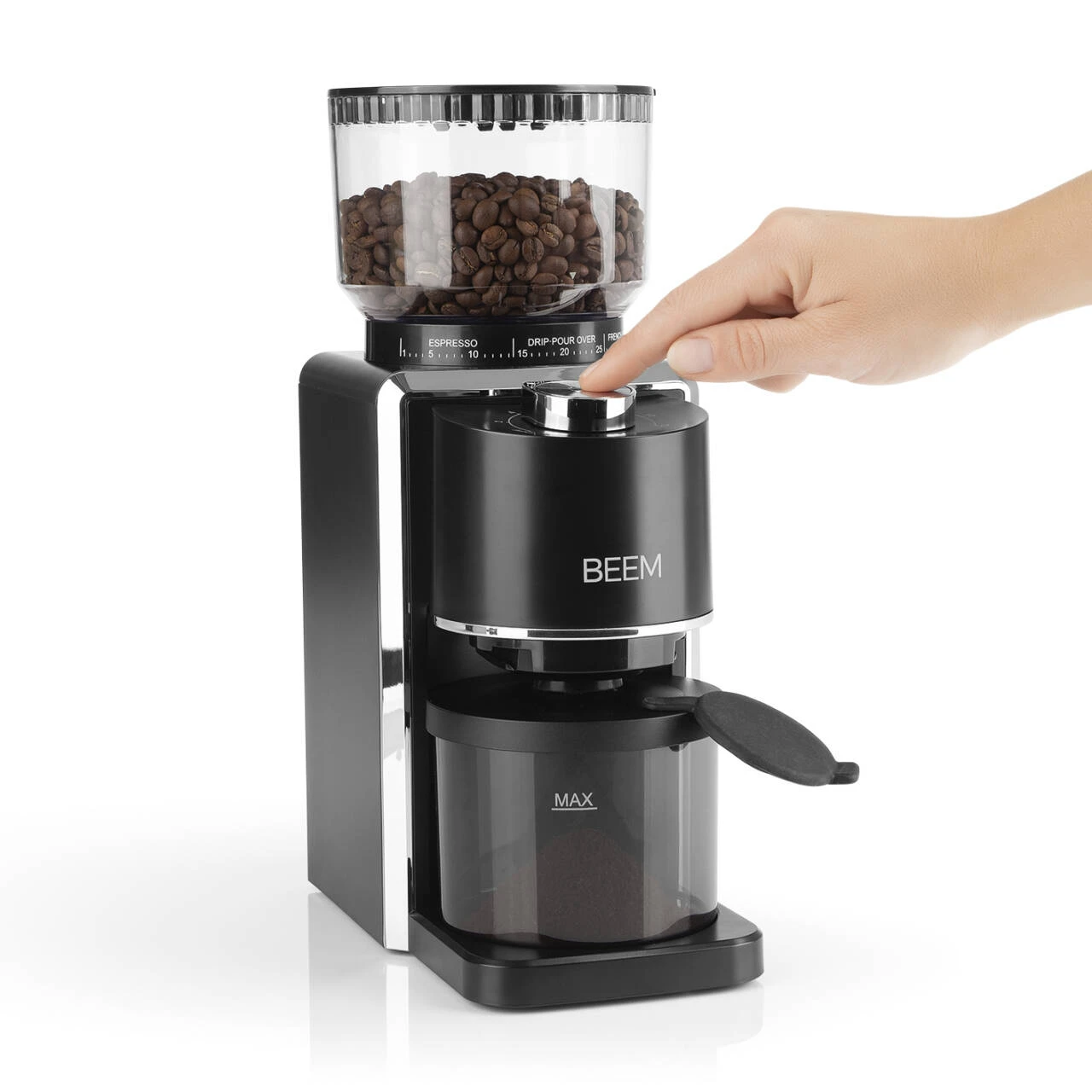 Die Beem Kaffeemühle Grind-Perfect für das Mahlen von Kaffeebohnen, besonders ausgestattetmit dem Siebträgeraufsatz zum Mahlen in den Siebträger für Siebträgermaschinen und Espressomaschinen. Pflege Tipp für Kaffeemühle: Durch den abnehmbaren Bohnenbehälter und den Reinigungspinsel können sie die Maschine einfach und leicht reinigen.