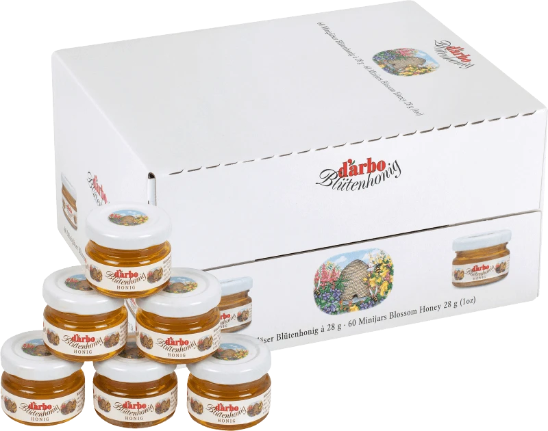 Der Blütenhonig ist besonders praktisch in den Minigläsern verpackt. Die kleinen Gläser können aber auch nach dem Genuss von Honig wiederverwendet werden.