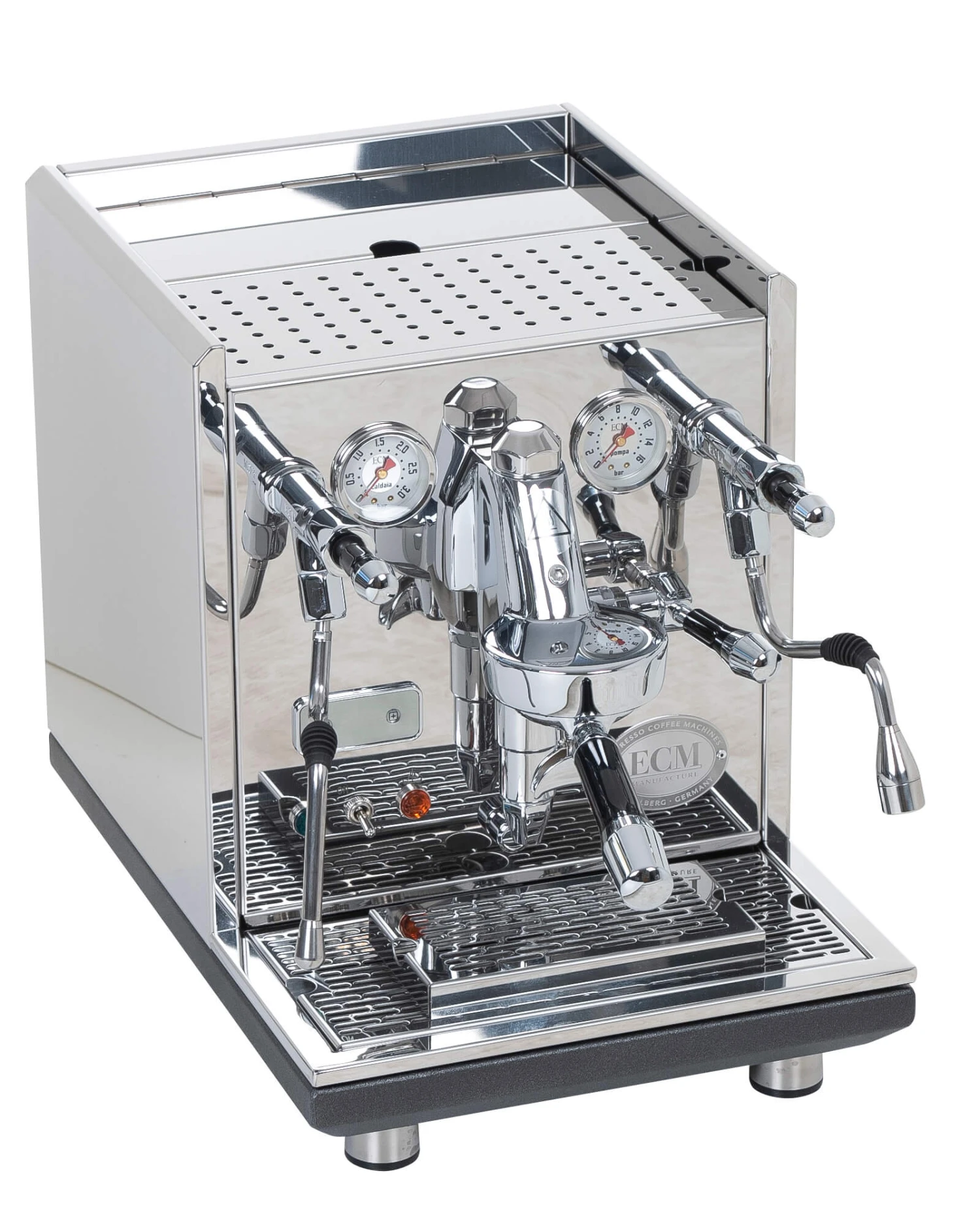 Mit dieser Siebträgermaschine zaubern sie genussvollen Espresso und können mittels der Dampflanze tolle Kaffeespezialitäten kreieren. Durch die Dual Boiler Konstruktion haben sie hierzu die idealen Möglichkeiten. Alle wichtigen Bauteile wie eine Rotationspumpe und eine hochwertige ECM Brühgruppe sind verbaut und werden in Form des polierten Edelstahlgehäuses mit einem dunkel abgesetztem Boden, elegant dargestellt. Das benötigte Zubehör ist im Lieferumfang der Espressomaschine enthalten. Im Lieferumfang enthalten ist: 1 Siebträger bzw. Filterträger mit 1er Auslauf und 1 ECM Siebträger mit einem 2-seitigen Auslauf, 1x Eintassensieb, 1x Zweitassensieb, 1x Blindsieb zur Reinigung, 1 Metallschlauch für den Festwasseranschluss, 1 Tamper und 1 Reinigungspinsel.